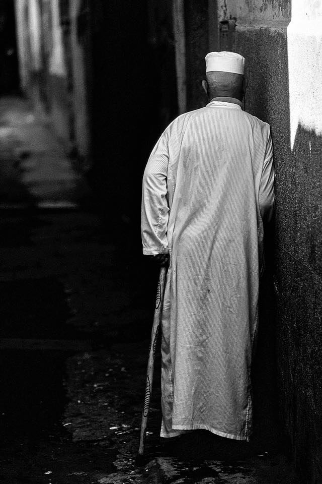 All’imbrunire le strette vie della città di Essauira in Marocco si erano spopolate. Il fotografo andava a caccia di soggetti per qualche scatto in quella penombra che era invitante, ma non c’era nessuno. Improvvisamente vide incedere lentamente davanti a sé un anziano, indossava una tunica bianca, sulla testa lo jebba, tipico copricapo locale, appoggiava la mano sinistra ad un bastone rustico intarsiato con figure di pesci e col braccio destro cercava sostegno sul muro. Sembrava stanco, o forse non aveva forze sufficienti.Il fotografo fu colpito dal contrasto dei colori, tunica e jebba bianchi contro gli scuri muri della via immersi nella penombra. Decise di effettuare prima lo scatto per non farsi sfuggire quella combinazione così insolita e poi si avvicinò all’anziano per aiutarlo a raggiungere la sua abitazione.