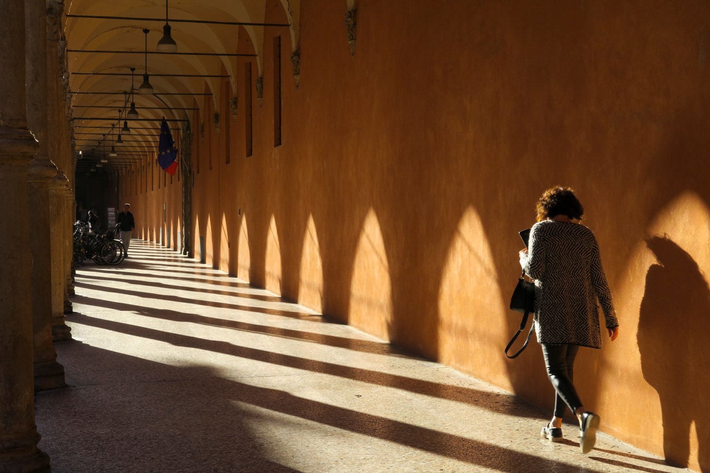 Camminava con lo sguardo basso rasentando il muro, assorta nei suoi pensieri, la sua ombra la seguiva. Il sole si stava alzando e illuminava il loggiato, una luce calda sembrava disegnare sui muri la sagoma degli archi che accompagnavano il percorso della donna. Lei incurante della magica atmosfera intorno a sé procedeva inarrestabile. Avrebbe risolto il suo problema? I dubbi e le perplessità si sarebbero appianati? Così procedendo non si accorse nemmeno che era seguita da un fotografo a caccia di uno scatto che catturasse quel momento luminoso insolito. In fondo alcuni passanti ammiravano le motociclette parcheggiate, ma la donna non li vedeva, continuava a camminare come avvolta in un misterioso alone impenetrabile. E così il fotografo decise di inquadrare il loggiato illuminato dalla calda luce solare, e includere nella scena anche lei, la sconosciuta donna con la sua ombra, e scattò.